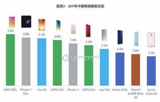 在2017年,小米止跌反弹。雷军当时称小米是第一家在销量下滑后还能逆势反弹的手机厂商。但小米当时的逆势增长的引擎来自于印度市场,在国内市场已不容乐观。当年Counterpoint整理的“2017年中国最畅销的十大手机”的榜单中,基本上被OV、iPhone、荣耀等厂商承包,小米只有一款红米手机进入了第九名。