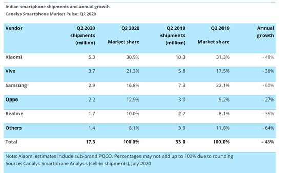 而小米在印度市场性价比玩法,已经被OV学习复制,尤其是vivo,从2019Q1的13.1%,在一年内迅速上涨至2020Q1的21%。