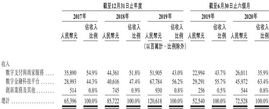从收入结构来看,包括微贷科技、理财科技和保险科技三大数字金融科技平台服务已成为蚂蚁集团营收增长的最核心驱动因素,2017年至2019年该部分业务的收入占比分别为44.3%、47.4%和56.2%,2020年上半年的占比则进一步增至63.4%。