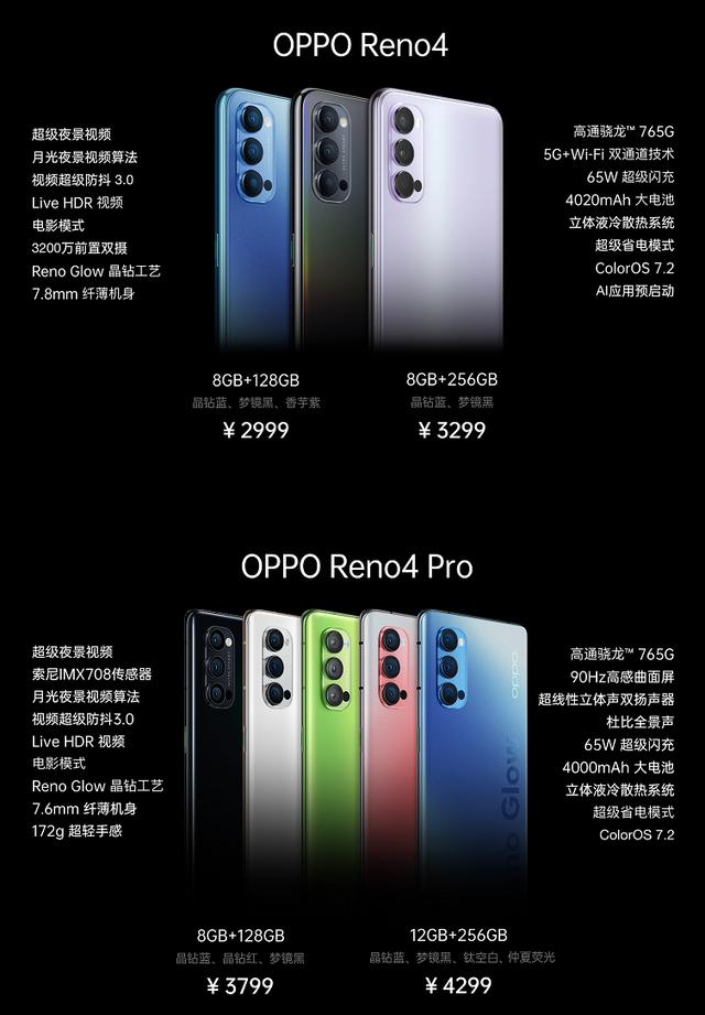 这次 Reno 系列分为标准版和 Pro 版两款,主要区别是在照相和屏幕方面,标准版 8GB+128GB 售价 2999 起,Pro 版 8GB+128GB 售价 3799 起。
